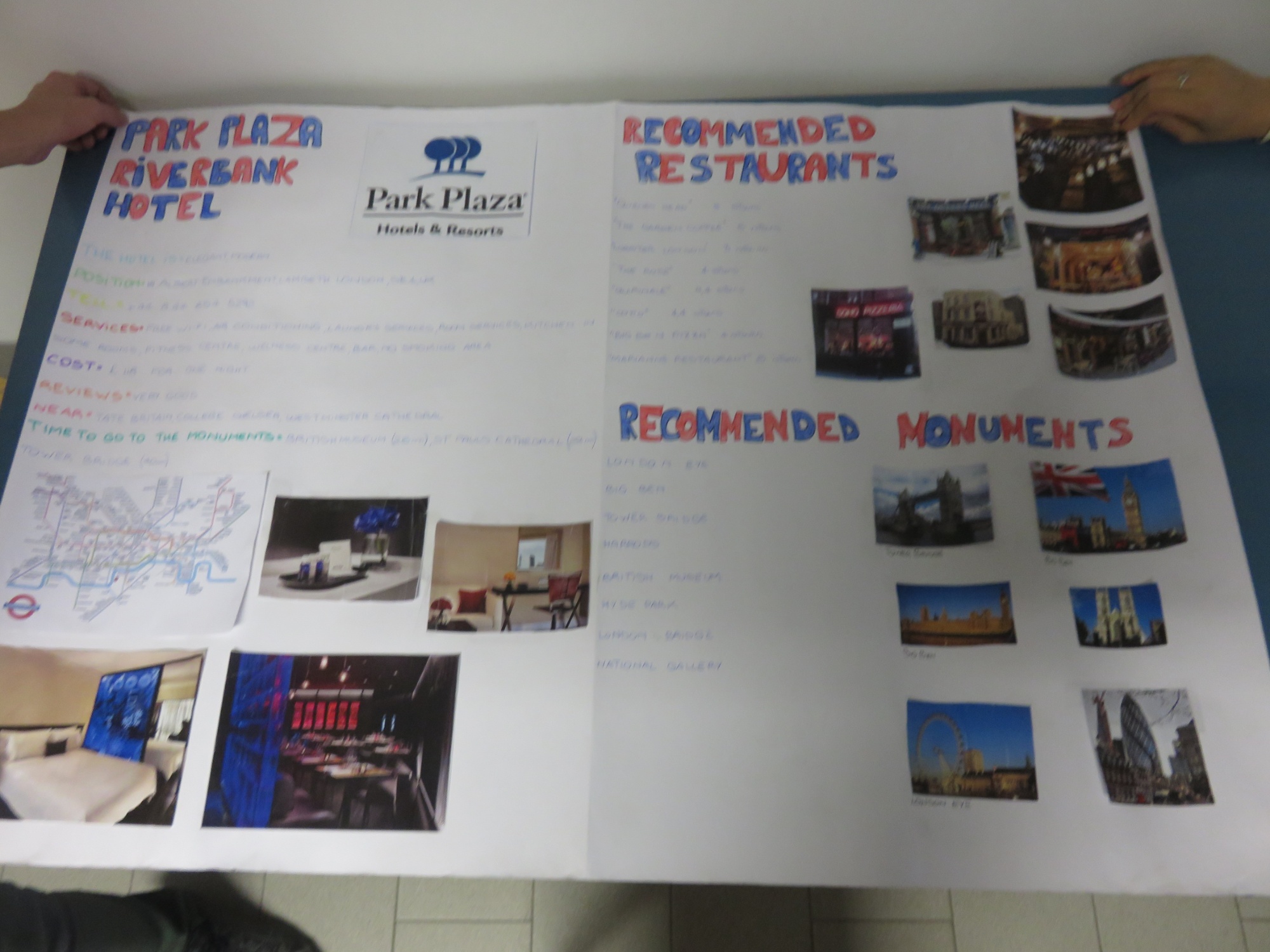 • Teacher says: 'I need a group working on the logistic aspect of the trip organization  from departure to arrival mentioning the means of transport used ; I need one group working on hotel accomodation and provide information about  the name of the hotel, where it is located in London , price per night and facilities provided by the hotel; I need a group working on  six recommended monuments ( Big Ben, London Eye, Buckingham Palace, Tower Bridge) situated on the north and south riverbank of the Thames; I need one group working on another city of the UK that might be visited during the staying: York (or Edinburgh or Stonehenge).