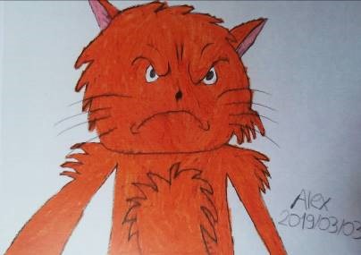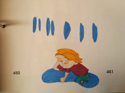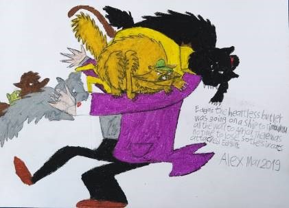 Here is one of my favourites. The idea is derived from another book but she has made it her own. The text reads: Edgar the heartless butler was going on a ship to Timbuktu all the way to Africa there was no time to lose so the six cats attacked Edgar.