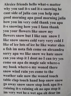 Alex came to love typing and now she touch types and her fingers whizz in a blur! Here is some of her early typing. Now is the time to tell you that English is her second language. Her mother tongue is Hungarian. Look at this text and see how she is trying to represent the English word sounds she hears in her mind.