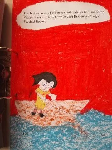 This page is near the end of a 300 page book written in German. The medium here is oil pastels, hence, the very intense, thick red background. Note how she has turned the pastel on its side for the boat and for the sea and dragged it across the surface creating a totally different texture. My guess is that this was driven by economy of effort but who knows perhaps she did appreciate that it enriches the picture.