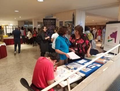 Here is Alex at work during the APPI teachers conference in Lisbon in 2019. Some of Alex’s books and all her story post cards are on the table. Julia is talking to a visiting teacher. A nice touch is that Alex’s exhibition is next to OUP who publish some of my books!