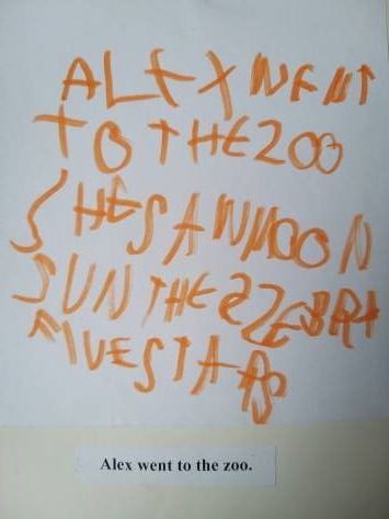 Interesting her choice of upper case letters. Note the absence of punctuation. In her early years she went through the stage of writing like the early Romans who did not leave spaces between words! Then the Romans and Alex began to realise that from the reader’s point of view it was helpful if each chunk of meaning could be easily identifiable.