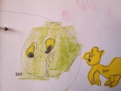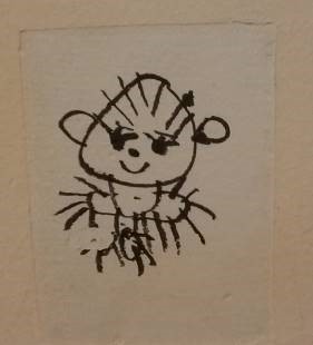 It is on the wall in our bedroom. When re-painting the room we have always painted around the drawing. We have never taught Alex anything. Her explorations have been treasured. She has no idea what a mark or a grade or a gold star is!