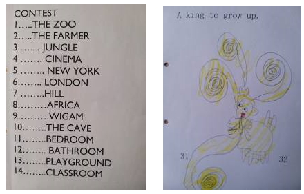 I introduced Alex to the idea that she can make books. Alex made the story poked along by my questions. I had NO hidden story of my own; my questions were according to my curiosity about what was in her mind. I made the zigzag book and typed out her story and stuck the text on the page and she added the pictures and some words of her own.