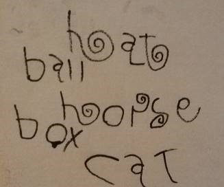 2 She noted that ‘Elephant’ was big with ascenders at the beginning, a descenders and an ascender in the middle and an ascender at the end. Cat was small with a big letter at the beginning and an ascender at the end. (How important it is to offer lower case letters to children! And on road signs!)