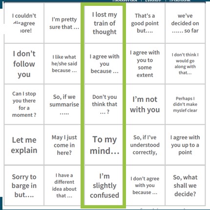 Let’s change that original Bingo concept, and make it more student-oriented. The activity I will describe I’ve called Rigged Bingo. Why rigged? Because the outcome of the game is clear from the very start, the point here is to reach that outcome. I play this version with e.g. language of debates / language of opinion. During the previous lesson students analyse various functional language connected with debating. We look at various phrases for expressing thoughts (e.g. To my mind, I believe that, I would like to point out that…)¸ agreement (I couldn’t agree more, I completely agree, great minds think alike), disagreement ( I couldn’t disagree more, I hate to pick holes in your argument but…), partial agreement ( I agree to some extent), interruption ( Sorry for barging in…), asking for clarification ( I’ve lost my train of thought, I don’t follow you), summarizing (So what have we decided so far, let’s agree to disagree). The list is long - approximately 40 phrases. How to help students learn/revise so much functional language?