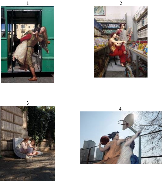 This activity is really simple and has been inspired by the Ukrainian artist Alexey Kondakov’s  digital collages,  in which classical characters are superimposed onto modern-day scenes  of contemporary life.