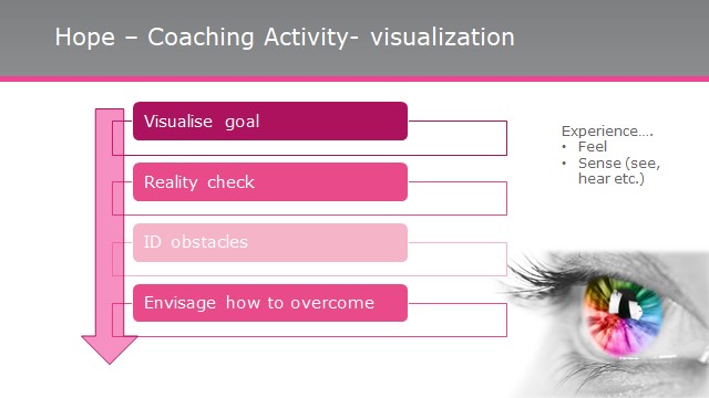 Michaels (2010) suggests that a coach can employ a powerful combination of behavioral and cognitive techniques and strategies in order to increase coachee’s well-being. What Michaels recommends is that a double approach is used - a set of specifically targeted behavioral techniques is introduced alongside significant shifts in thinking. The same approach can be easily employed in the classroom. Cognitive mapping is one of the examples indicated as suitable for a coaching intervention - it can lead to an array of positive changes such as better emotions management, less impulsivity, greater willpower or more efficient goal attainment (Michaels, 2010). Other cognitive techniques and strategies that may be utilized by the coach are visualization, positive affirmation, which have also been reported to positively affect well-being (Michaels, 2010).