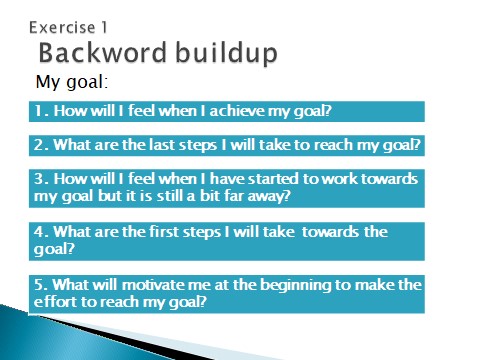 Visualise your goal ( use all your senses,imagine yourself having the goal attained, hear the voices around you and feel in your body the success)