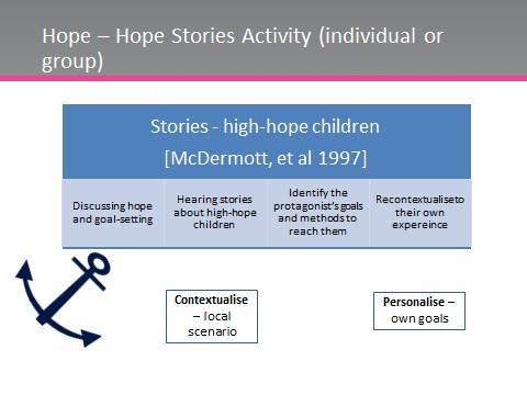 - Listen the stories about high hope children (you can use the book by Matthew Gallagher& Shane J Lopez The Oxford handbook of hope) and think how your students could incorporate hope into their life,