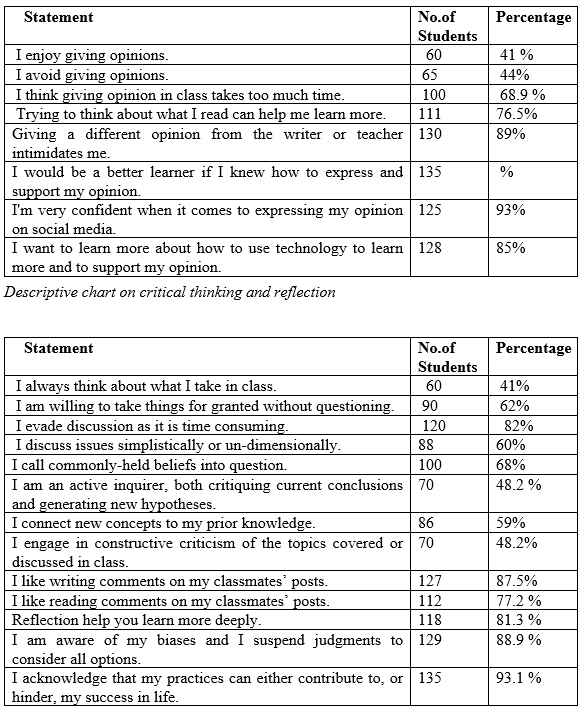 As for the end of term questionnaire, 180 took the questionnaire for 3 marks bonus in the years' work. 165 denoted they liked adding up the critical thinking activities to the ESL curriculum as the activities help them try to express their thoughts and support their ideas.  140 students denoted that they would like the continuation of the practice of adding critical thinking activities in the next English courses because it is a skill that they need in life. As for the questions concerning their behavior after being introduced to critical thinking, 150 denoted that they think about topics they read on, or heard about. 145 stated that they judge and comment on material sent to the Facebook group. 100 students stated they use e-resources to broaden their knowledge about different topics. 165 explained that they think critical thinking activities can enhance their educational and professional opportunities. 166 asserted the relevance of the content on these website on making them think critically and 169 students enforced the relevant role of the teacher in encouraging students to express their opinion. 170 students liked the idea of thinking and criticizing topics. 170 judged the experience of thinking and criticizing positively and denoted they would continue the practice.