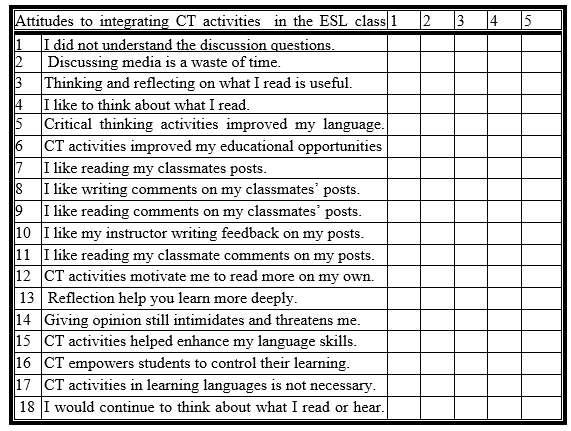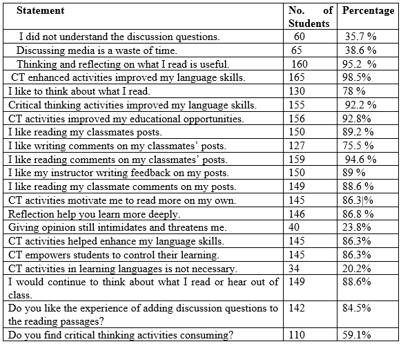 As for the open-ended question about the positives and negatives of adding critical thinking activities to the ESL curriculum, 80 per cent asserted that the critical thinking activities enhanced their skills of self-expression, ideas development, and the ability to develop their opinions. The only setback of the critical thinking exercises is that they are time consuming.