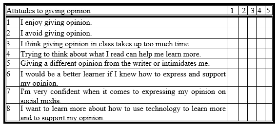 l=disagree totally   2= disagree  3=not strong opinion  4=agree 5=agree strongly
