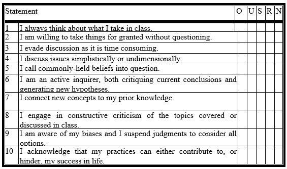 Reflective forms enhance critical thinking as they make students reflect on the topics they covered, connect them with the big picture (Elder et al (1994)). Students eventually become aware and conscious learners. Reflection is essential for reasoning and critical thinking (Siegel (1988); Stoller (1997)). The internet abounds with infinite examples of reflective forms.
