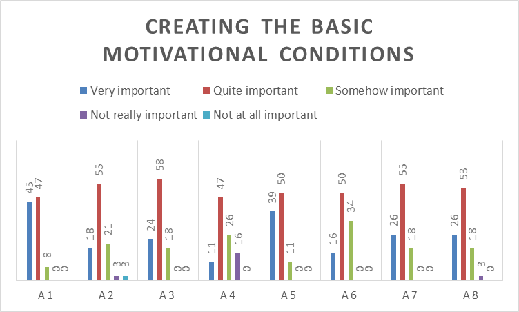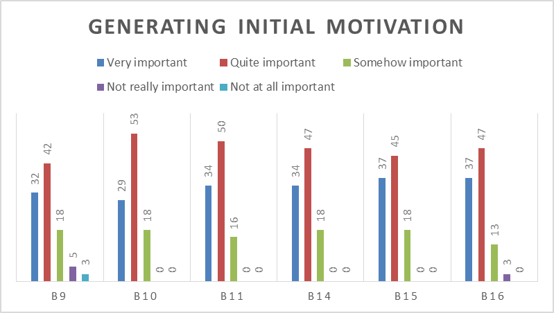 Dörnyei and Csizér (1998) and Cheng and Dörnyei (2007), indicate that language teachers should focus on setting a positive example (Teacher), makig a solid rapport with students (Rapport), creating a pleasant and relaxed atmosphere in the classroom (Climate), and making sure that students understand the tasks in which they are interested in (Task). When teachers concerned about teaching practices dealing with these macro-strategies, students will be more motivated in the foreign language classroom (Ruesch et al., 2012).