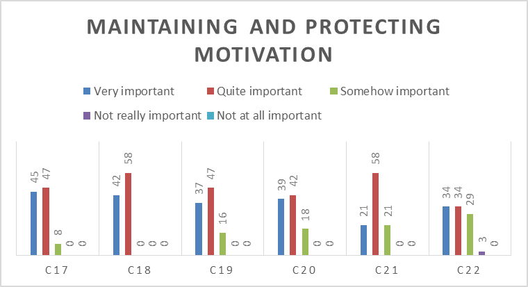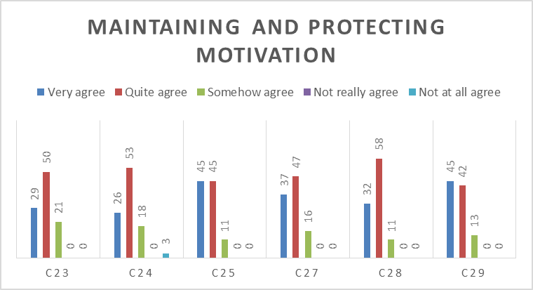 The figure shows that the construction of a specific goal is important, from the student's point of view to maintain and protect motivation. However, they are limited to short term. Besides, this strategy was not implemented in the class, as long-term goals were first given consideration. The lecturer can use the following steps, 1) asking the students to select specific short-term goals during personal studies; 2) focusing on the timelines to achieve the specific goals, 3) providing feedback to build up their motivation.