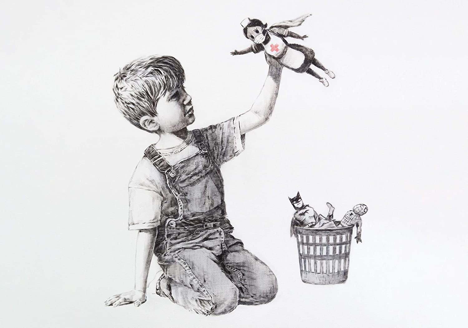 For this task, students will listen to a sound file in which Banksy’s artwork “Game Changer” (2020) is described (YouTube: https://www.youtube.com/watch?v=zuo-OH6_ozI or “BBC news: Banksy gave a lovely picture for the NHS”). Here, the sound of the video should be played from 0:09–2:09, while the screen is turned off. Banksy’s picture depicts “a young boy, kneeling down wearing dungarees and a white t-shirt. The waste paper basket in front of him has two discarded old superheroes. Instead, he is playing with his new model figure; a new superhero – an NHS nurse with a flying cape and arm pointing forwards like superman” (cf. BBC News 2020). Banksy painted this picture as a tribute to the NHS staff during the Covid-19 pandemic and gave it to the University Hospital Southampton. After the lockdown, the picture will be auctioned off to raise money for the NHS.