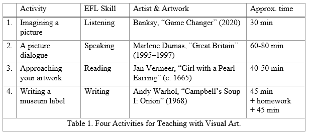 With this caveat in mind, this article suggests the use of visual art for EFL education and presents four short teaching activities for students. These activities combine (classical and contemporary) artworks with meaningful communicative tasks. Here, artworks, in combination with reading, writing, speaking, and listening tasks, are meant to offer “rich experiences in analysis, exploration, reflection, observation, imagination, experimentation, and communication” (NYSED 2010: 2) for EFL students.