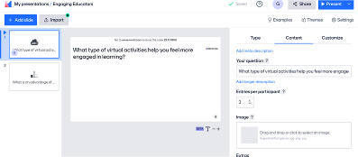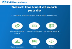 Poll Everywhere provides a similar concept to mentimeter, except it provides options for setup depending on the objective, corporate or academic and for each it provides its own setup of options to respond to polls. We see this as an advantage because the setup will be appropriate to each teacher/learner/user context and it validates the quality of creating a lesson or session that meets users’ needs and interests, as well as levels. Just like mentimeter it can be used for a quick initial review or to ask questions to assess learning throughout or at the end of the lesson. If needed it can be setup as quiz or longer assessment to comply with other formative assessment objectives, or even consider it for summative purposes. In our experience using the tool we created formative assessments to determine engagement at different points of the sessions.