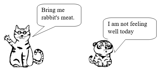 Next morning, the cat asked the tiger to bring him rabbit's meat. The cat understood his nephew was lying. He had noticed changes in the tiger's behaviour and voice.