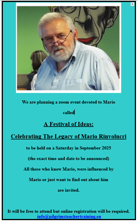 Then there is An Interview with Mario Rinvolucri  from 2018, in which he talks about his teaching and teacher training career. (More interviews and podcasts featuring Mario can be found here