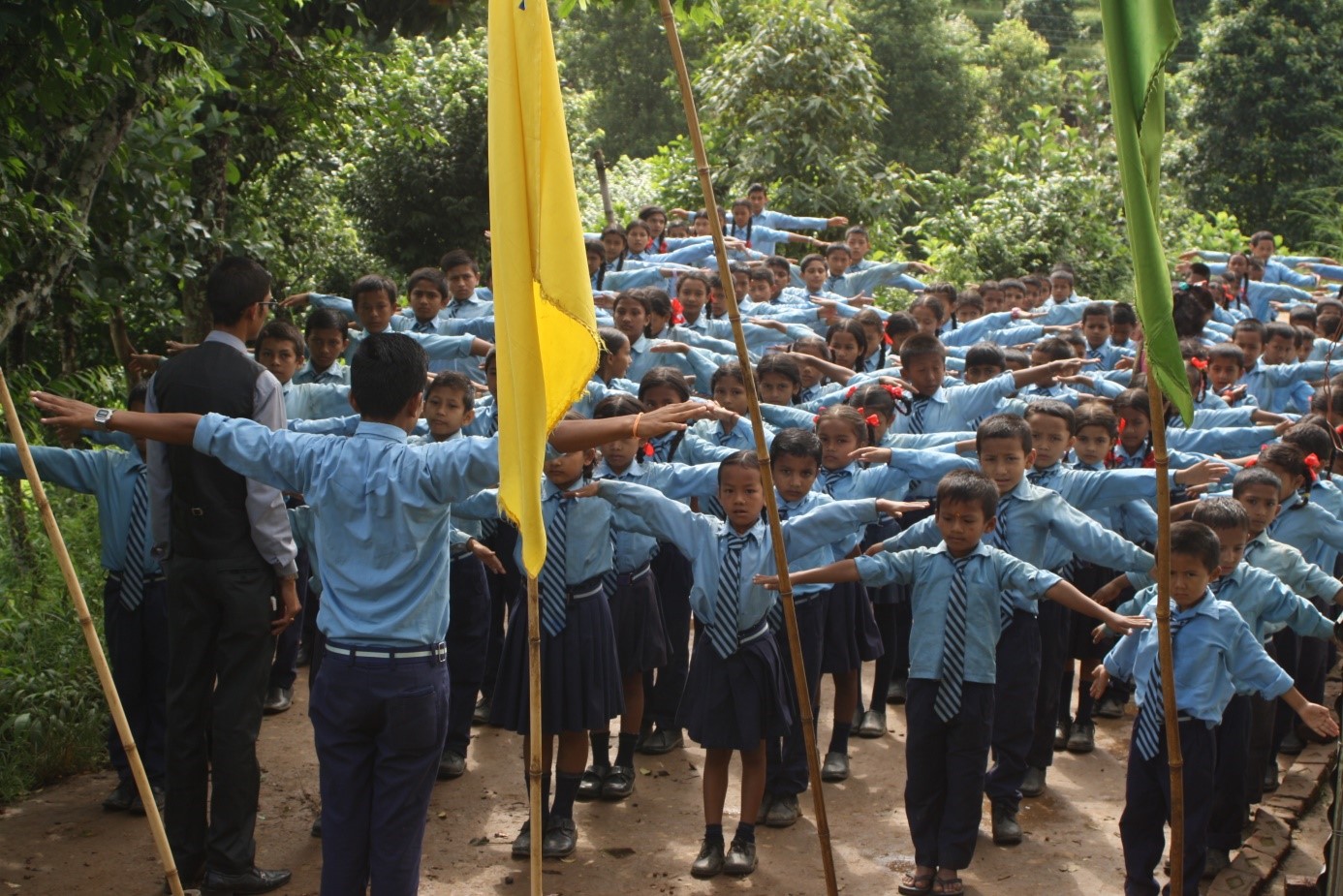 The pupils stand in exact rows one behind the other, the younger ones under the roof in front of the stone building up at the top, the older ones in the larger ground further down, next to the “barracks”. The teachers check the rows and the uniforms – light-blue shirts, dark trousers and striped tie for both girls and boys. Then one of the older students stands facing the bigger group and gives commands: “Attention”, “arms up”, “arms side”, “stand easy” – up at the top another student with a view down onto the ground imitates his movements so that the younger children standing in rows behind him can do the same thing. After what they call “exercises”, there comes the National Anthem. The students stand with their right hand firmly on their hearts and sing, sometimes accompanied by music when the old loudspeaker is not on strike and there was enough time to set it up in the first place. This is followed by more bellowed commands, then they say a short prayer and sing what they call the “national song”, another patriotic piece of music. By this time at the latest, upper and lower level are not in sync anymore which produces a kind of echo effect – and the younger students have a tendency to sing the songs more slowly anyway. They are reunited for another round of physical activity before a student steps up to the microphone and says something in Nepali that I, of course, can’t understand. The other students clap their hands, sometimes more, sometimes less enthusiastically. As I find out later, these students (each day a different one) recite a poem or give their classmates some quiz questions to answer. They are meant to practise speaking in public and in front of others that way. Then it’s "left, right, left, right" marching into their classrooms, one behind the other, swinging arms vigorously. That is, except for some of the younger pupils who had to watch the ceremony lined up along the wall, with their arms folded on their chests and their right hand holding their noses – they had arrived late and were thus disciplined in order not to forget to be punctual the next day.