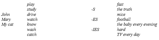 The usage of the 3rd person singular ending –S/ES in Present Simple positive sentences can be taught with the help of exercises where students are asked to choose the correct subject of the sentence, in the singular or plural, e.g.: You/ John always drives too fast; Mary and Peter/ My mom like parties, or the correct verb, e.g.: John always drive/ drives too fast.