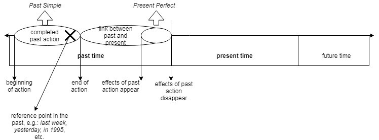 Present Perfect Tense should be compared with Past Simple Tense, which can be done again with the help of a time scale in order to make it clear that Past Simple refers to a definite time period in the past, whereas Present Perfect expresses an indefinite time period between past and present. With Past Simple, the reference point in the past presupposes that the state/ event has a beginning and an end. With Present Perfect, where there is no reference point in time, the speaker has in mind the link between past time and present time, e.g.: I have read this book, or the result of past activities, e.g.: He has written three novels. The completed action expressed by the Past Simple verb form finishes before the effects of the past action appear. If we manage to explain that to students, they will understand the difference between past state/ event and the result of past states/ events (see Diagram 2).