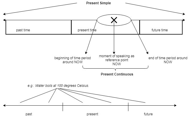 When explaining the differences between Present Simple and Present Continuous, it seems preferable to illustrate them visually using a time scale exemplifying the notions of past time and present time. We can make the point that with Present Simple the state/ event has no beginning or an end because there is no moment in time as a reference point. We think of past, present, and future time together which is why we do not use expressions such as now or at the moment with Present Simple Tense. The state/ event is regarded as a sequence of recurring states/ events in the past, present, and future. That is why adverbs of definite or indefinite frequency are used with Present Simple Tense which show how persistent is the characteristic or activity we are interested in.