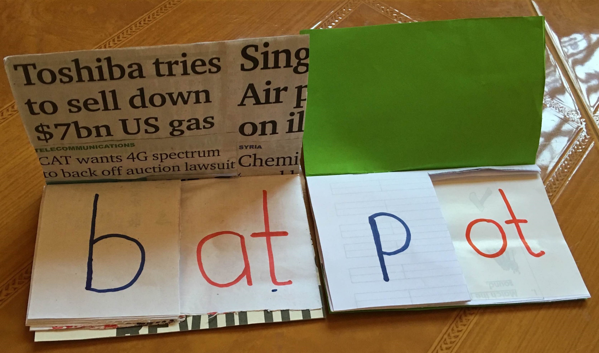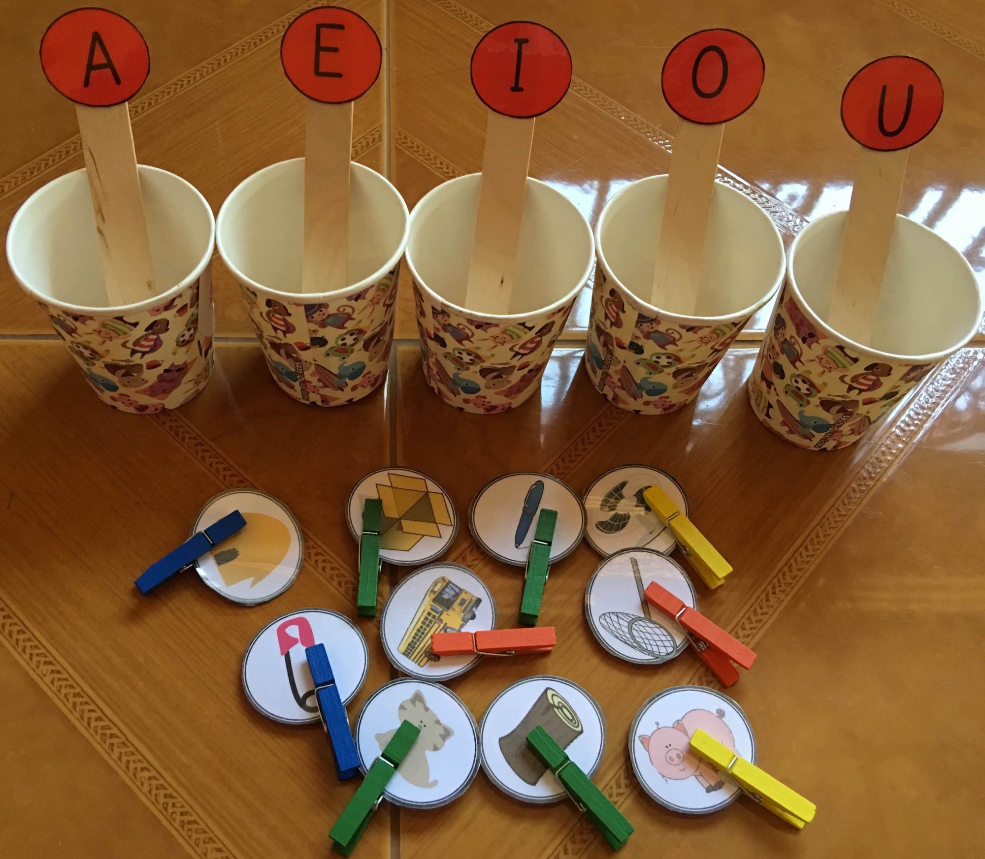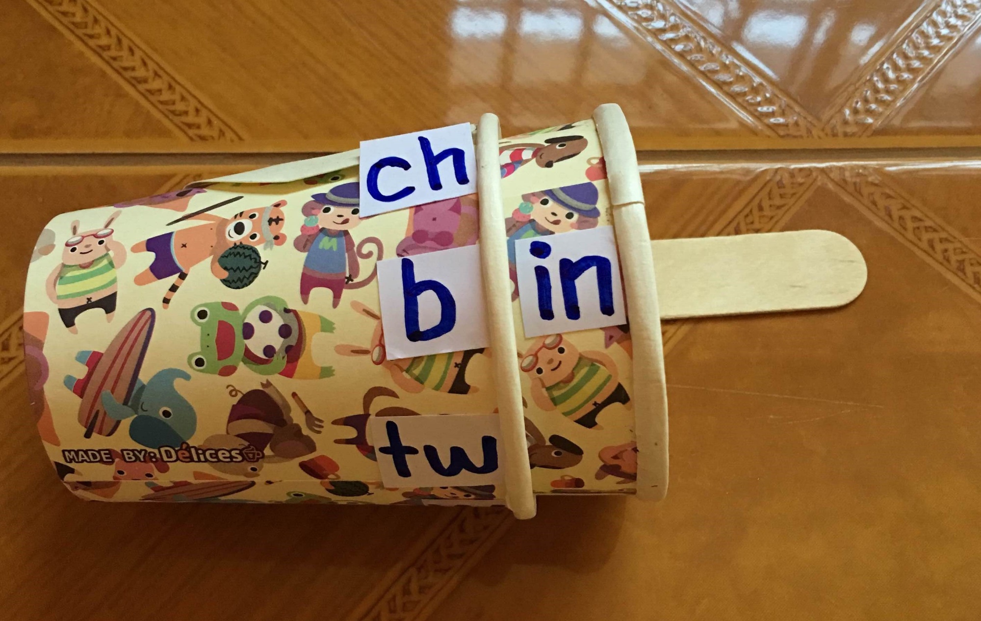 We used two paper cups, one placed inside the other, with target graphemes printed on them. The cups are twisted to reveal letters and words (see Figure 1).
