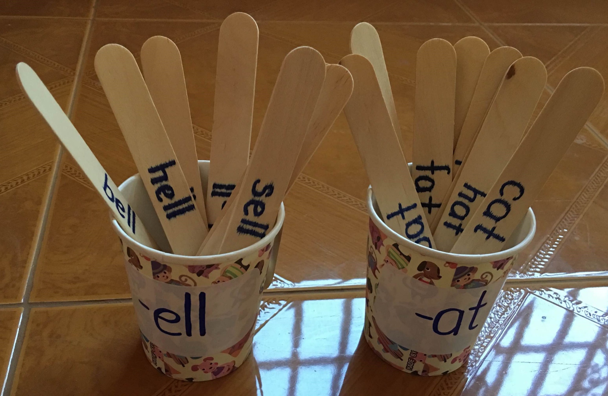 - Segmenting: on each cup, write the rime of a word family (‘at’ and 'ell' in the example in Figure 8). Learners place pictures on cards or words on ice-cream sticks into the corresponding cups (for example ‘cat’, ‘hat’ and so on). The pictures on the card could be color-coded for very young learners as a self-correction device. Older learners could do this activity in groups as a relay race.