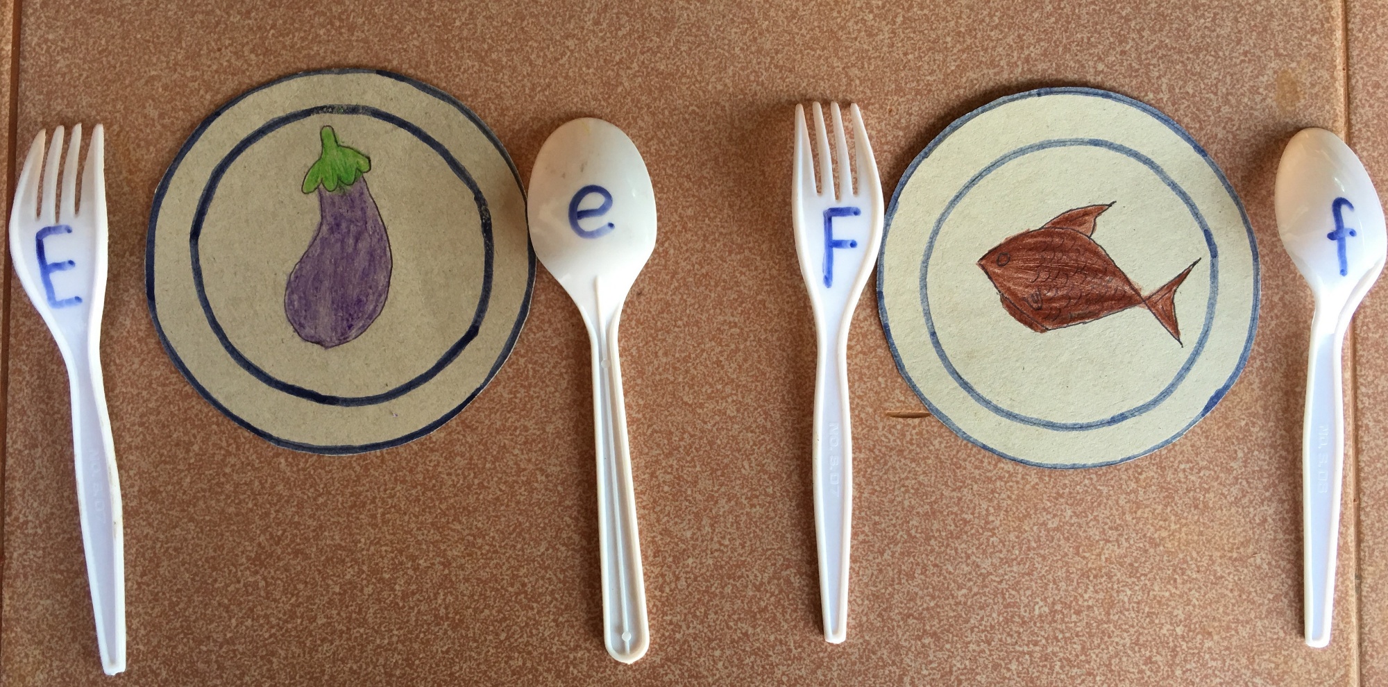 - Phonemic awareness: the teacher (or another learner) calls out a sound and the learners identify the letter by holding up the correct spoon. A matching activity could be done with learners matching the spoon with a sound to a picture.