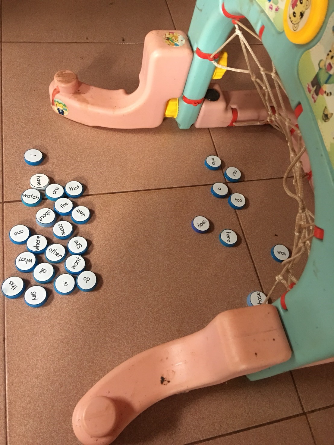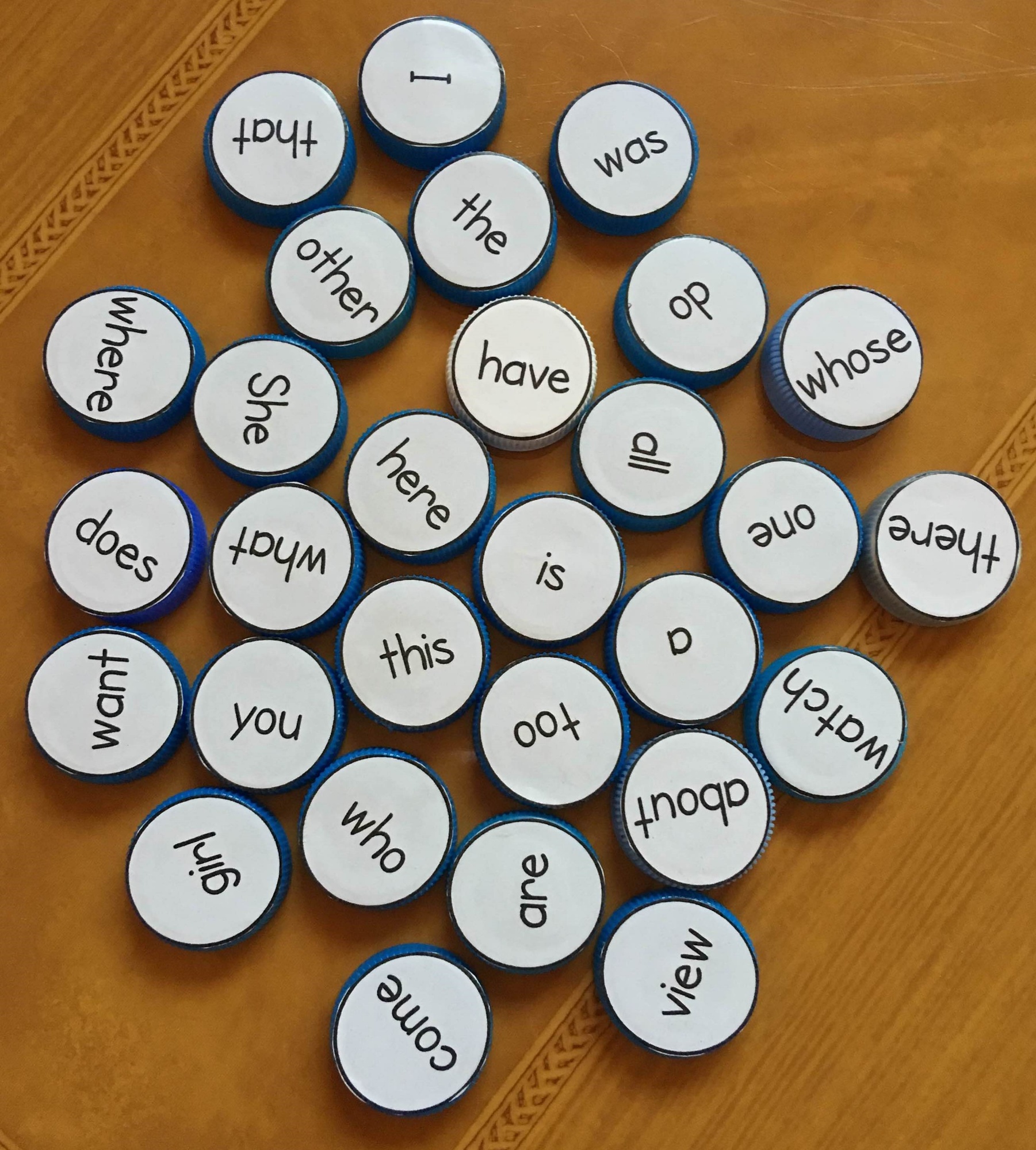 This activity has learners reading the sight word written on bottle tops, and in turns trying to flick them into the 'goal'. We found a children's toy to use as the goal, but an old plastic waste-paper basket cut in half also works well.