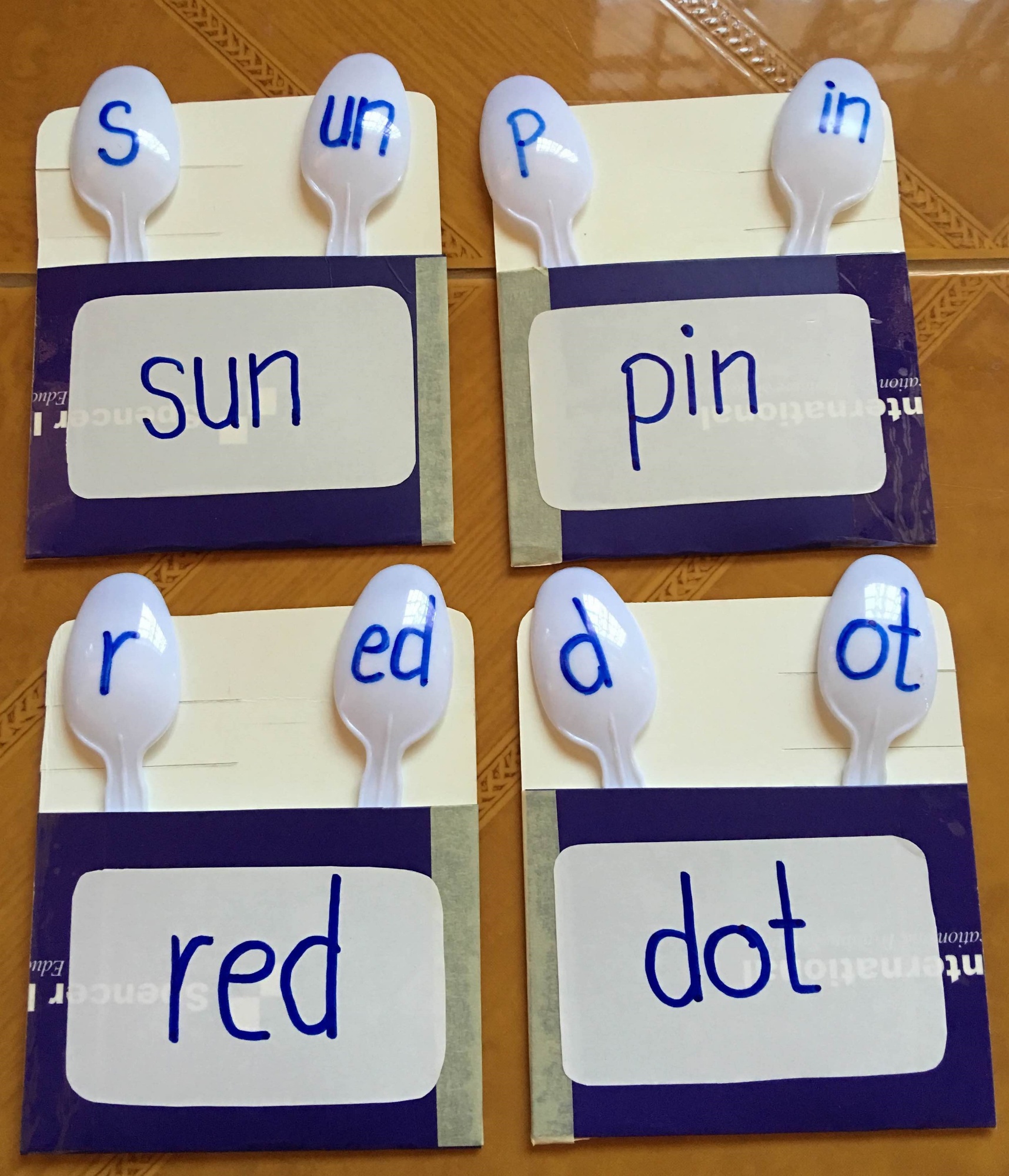 - Segmenting: learners match the onset of a word to the corresponding rime and substitute the spoons with each other to make a variety of words. Using ‘spoons in a pocket’ (see Figure 2), played individually or in pairs, learners find the corresponding spoons that match the word on the pocket. The pockets are old files folded and taped to fit the spoons