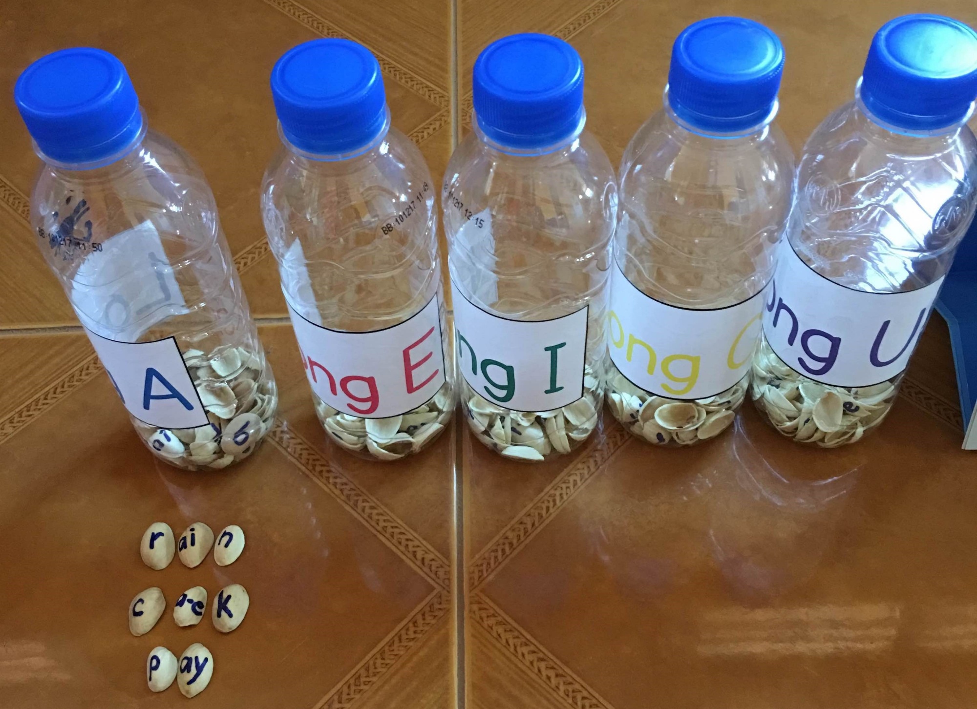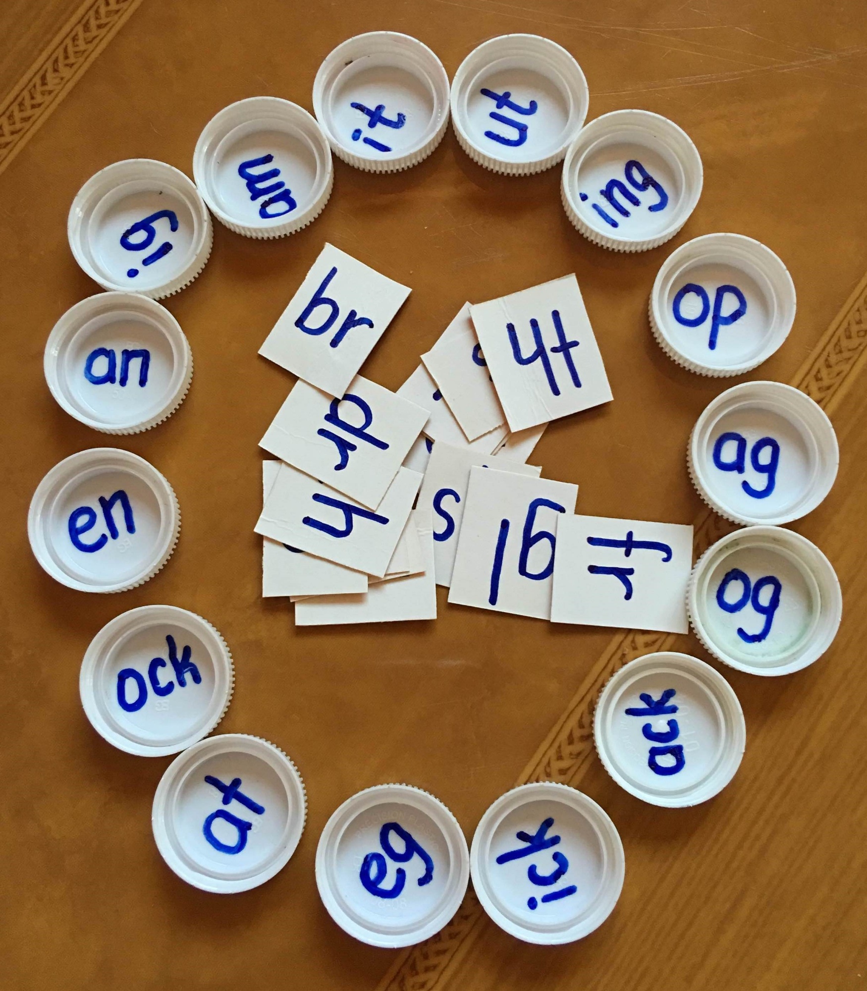 - Segmenting: we wrote the onset on off-cut pieces of card and the rime on the inside of the bottle tops (see Figure 5), however the cards could be substituted with bottle lids of another color. Learners match a card (onset) with the bottle tops (rimes) following a teacher's prompt. This activity encourages the learner to recognize the beginning and ending sounds of the words, as well as the sequencing of the sounds to make the word. Allowing the learners to match onsets to the rimes independently also activates blending skills.