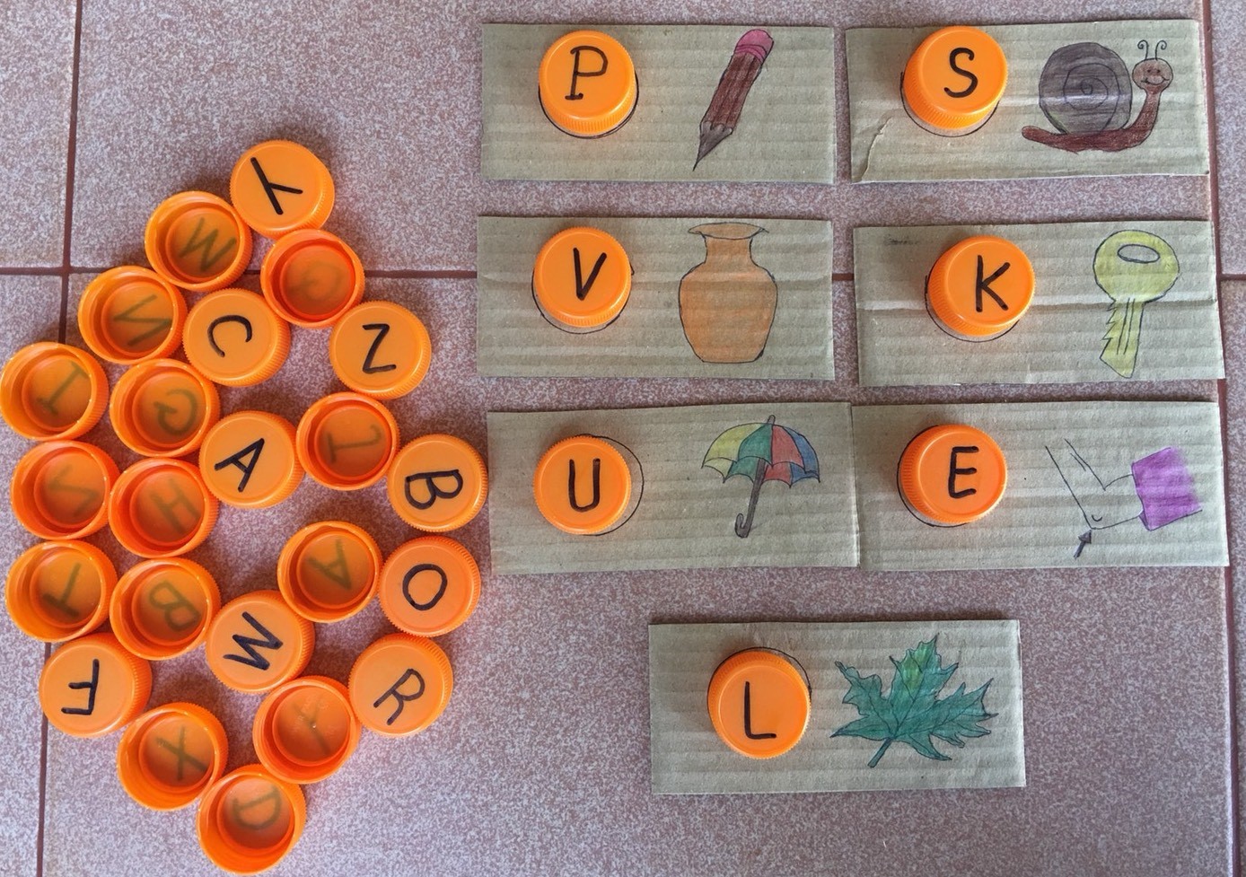 - Phonemic awareness: bottle tops are matched with the pictures of words that start with that sound. In the example in Figure 4, the pictures have been prepared by the teacher, but having the learners contribute by drawing pictures before the task would potentially increase student ownership of the task and learning materials.