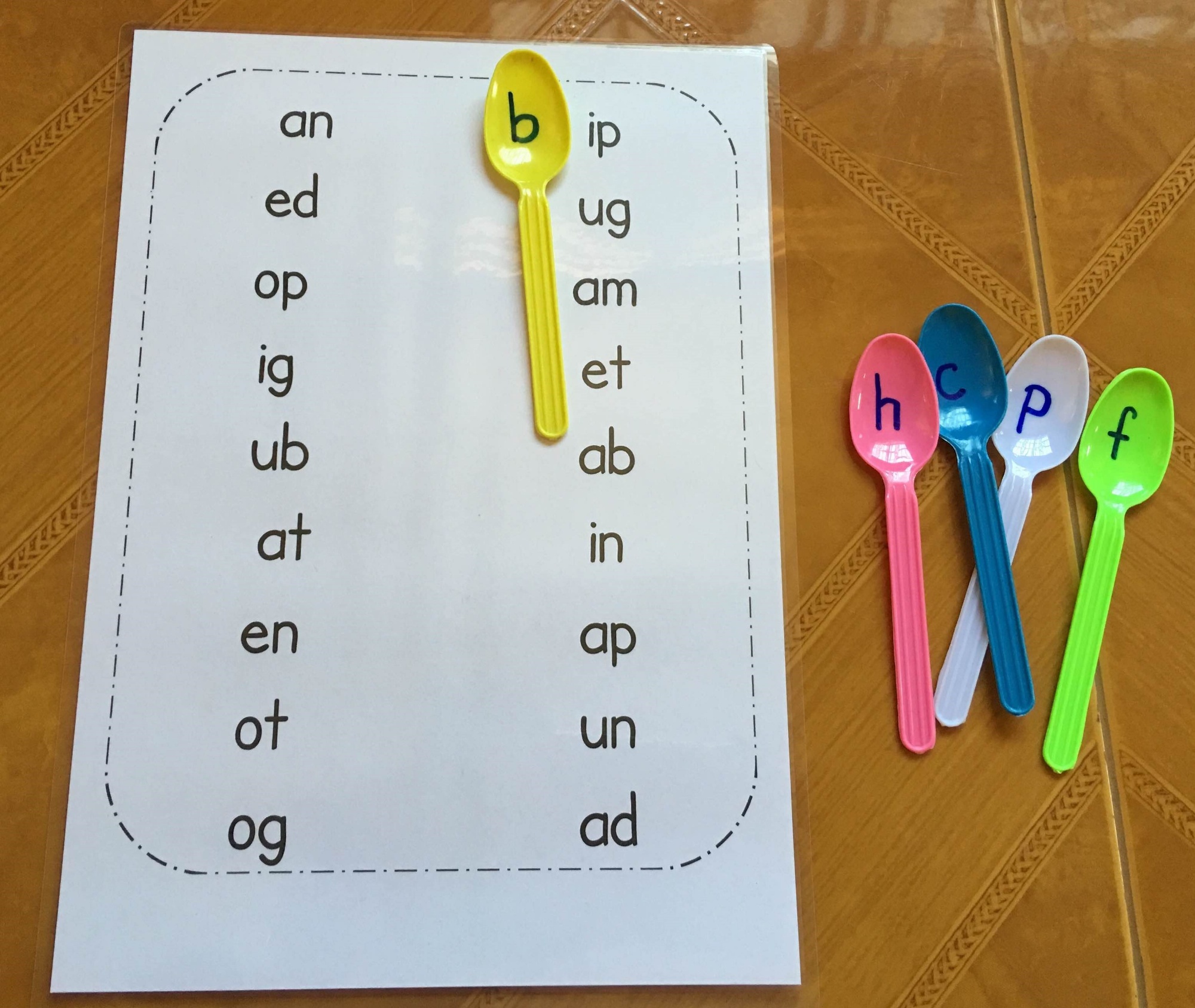 We wrote letters onto plastic spoons with a magic marker. With these, we were able to create a number of phonics activities.