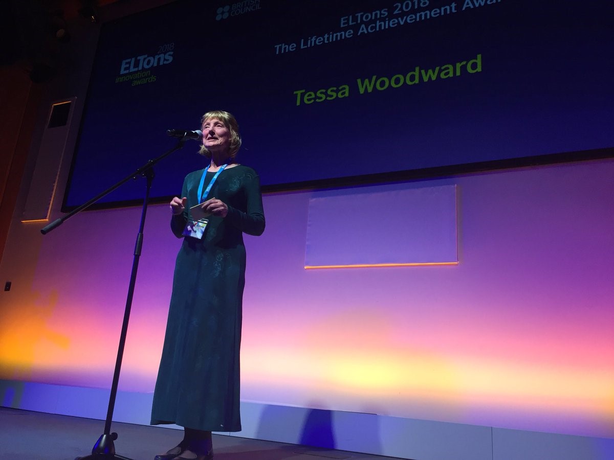 Helena Gomm of English Teaching Professional announced the winner of the Lifetime Achievement Award –Tessa Woodward, a teacher, teacher trainer, author, and past IATEFL president, who Gomm described as not only having “her fingers in all the ELT pies, but achieved a great deal in all of them”.