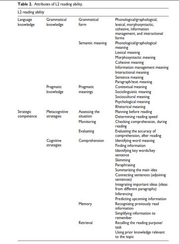 Another study related to reading was done by Kim (2015) in exploring how a placement test score could be used for diagnosing the L2 reading ability of incoming students to an adult ESL program. The list of L2 reading attributes was developed by drawing upon previous literature on language ability models as shown below: