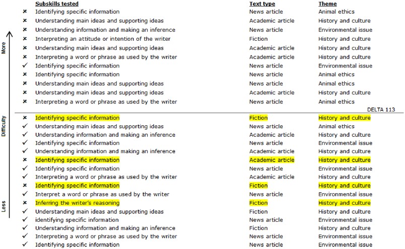 Another example of the development of Diagnostic Language Assessment is of Reading: Diagnostic English Language Tracking Assessment (DELTA) which tests a range of subskills across various text types and addresses a range of different topic areas. The figure below presents the reading subskills tested in DELTA, and gives an example of which subskills a particular learner performed poorly on (indicated with a “x” and highlighted). The diagnostic report is “based on the item difficulty relative to the student’s proficiency. If they are not answered correctly, they indicate possible weakness in that particular subskill” (Urmston, Raquel, & Tsang, 2013, p. 74 in Harding et al. 2015).