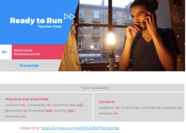Hi Hania it was good to hear back from you last week. We have another update for HLT. Ready to Run’s new topical video-led lesson packages with YouTubers launched last month with an A2 item on lockdown. The next episode is now available: at B1+ our resident vlogger Ben explores the language of feelings and emotions as he reports on his state of mind during the epidemic. The lesson packs for teachers and learners are optimised for online teaching, and develop all four language skills with the focus on generating adjectives from nouns.
