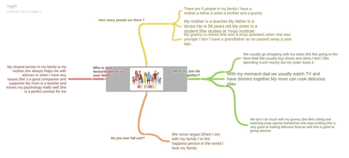 As a terminating part, the following step comprises a full performance of learners. The learners were asked to take write short essays based on their mind-mapping information.After being observed and having their mistakes verified, the learners try to use the mind maps and perform in front of the class. The ones who still felt hesitation and had high affective filter had an opportunity to make a short recording or record a video while talking about their family. The next topics that were given prior in the syllabus were also made up utilizing this approach.