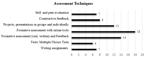The three assessment approaches teachers found effective were formative assessment with online tools and that given orally and in written forms with feedback and finally, individual group projects provided with feedback, with 18, 15 responses each (Figure 4). These findings are consistent with the several other studies (Huang, 2006; Cheung, 2018; Omar, 2020; Erdil-Moody and Thompson, 2020); they highlight the role of promoting interaction in cooperation, giving praise, constructive and positive feedback, encouraging challenging collaborative, group work and cooperation in small groups in their investigations, while Omar (2020) also revealed that choosing the right learning platform was crucial for maintaining learners’ motivation.