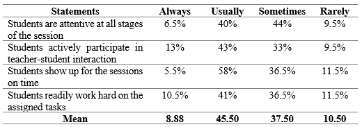Overall, teachers reported having positive views on students’ motivation levels (Figure 2). In particular, 58% of teachers believe that students are usually on time for classes, while around 40% admit that it is the case sometimes. Similarly, more teachers said that students usually work hard on given tasks and actively participate in teacher-student interactions (41-43%), with marginally lower figures for sometimes.