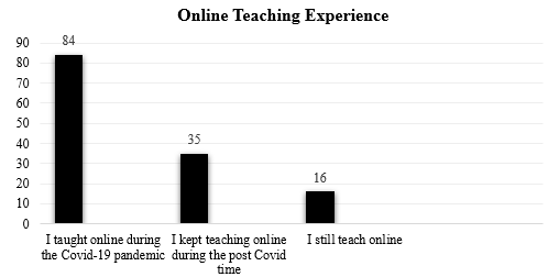 As Figure 1 shows, most teachers started teaching online during the pandemic, at 84 %, while over a third continued their online classes after lockdown; 16 % claimed they still teach online. That most teachers in universities were exposed to teaching online during the Covid-19 pandemic was an anticipated finding, for representatives from all spheres, including teachers, were forced to this massive transition of performing job-related tasks online.