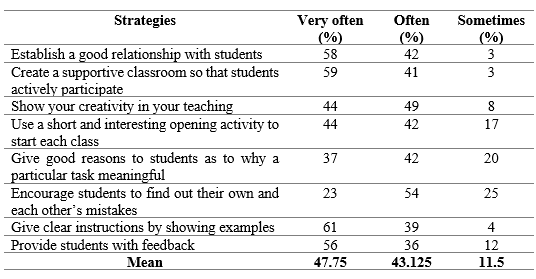 Besides, the subsequent most frequently used motivational strategies were using short opening activity to start each class (1) and showing creativity in teaching (2), both used by almost 45 % of the participants. Similarly, teachers in Omar’s study (2020) showed enthusiasm for teaching by customizing the materials to accommodate the students, which, in turn, requires creativity.