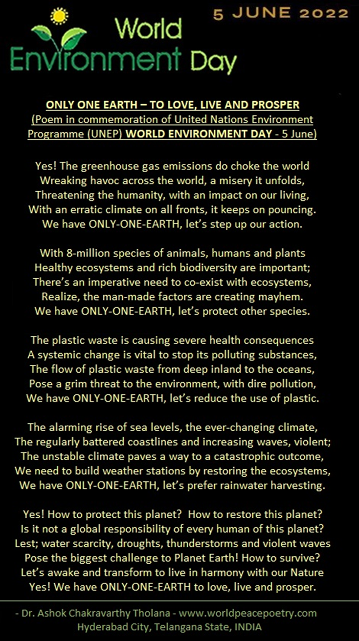 As part of shouldering responsibility for protecting and promoting environmental consciousness among one and all, as global citizens, we need to take the liability to project the importance of our environment, as well as ways and means to protect it.  The United Nations Organization undertakes the mammoth task as United Nations Environment Program (UNEP) and celebrates it as WORLD ENVIRONMENT DAY - 2022 on the 5th of June each year.  The objective is to awaken human consciousness and concern to protect and preserve the nature and environment which in turn protects Planet Earth.