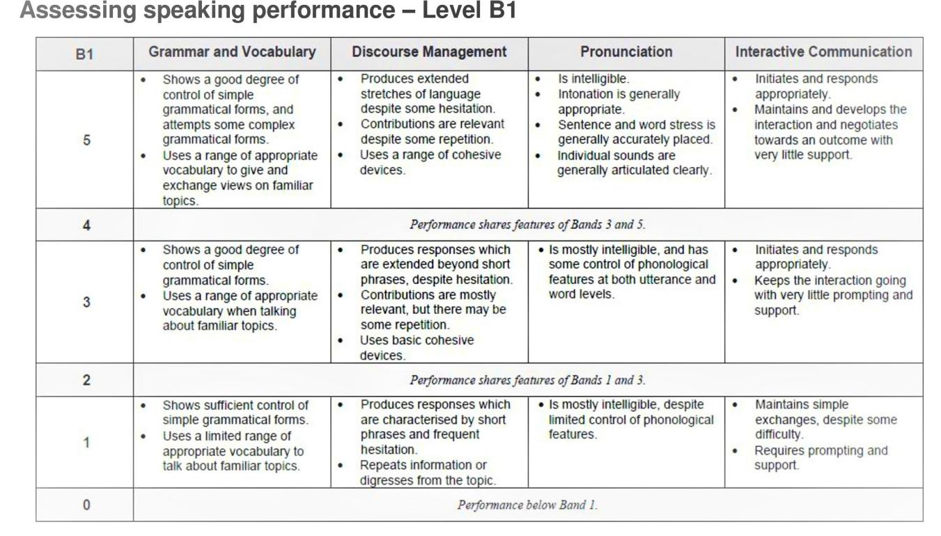 Awarding 5 marks, or below, for Vocabulary and Grammar (speak slowly and selectively, and use only the words you’re able to), Discourse Management (don’t hog), Pronunciation (articulate like a steel trap), and Interactive Communication (know when to shut it), with an overall application of Global descriptors, amounts to x5 from whatever score the student has amassed out of 20. If the assessor determines the student has 17 marks. e.g., the average is 4. 25, which is routinely added (21. 25) to arrive at 25% of the exam total. Although the rubric can be applied more strictly, and training centers do vary in their rigorousness in terms of descriptor application, it’s recommended that teacher and students, when preparing for the KET, PET, or FCE, refer to examples of the Cambridge exam proper, as the relatively unchanging format is an industry standard.