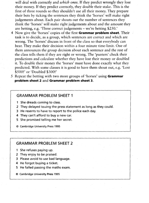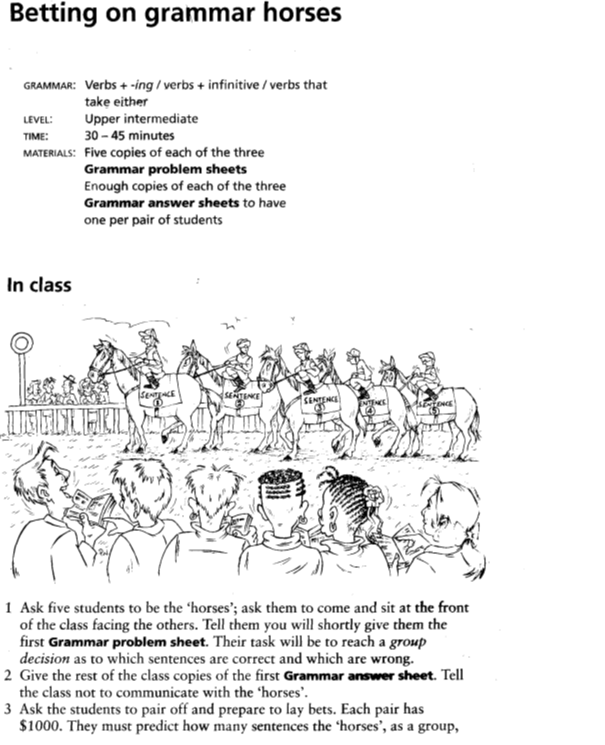 The very first activity in the book “Betting on Grammar Horses” (see below) is a very good example of how Mario and Paul thought about language, how they observed language and how they got inspired. It is noticeable that they wanted learning and practising grammar to be fun, meaningful, natural, and communicative. And… they were inspired by an Italian quiz show! In other words they not only imported the activity to the UK but they also imported it to ELT. It was so typical Mario in Paul to find inspiration everywhere…