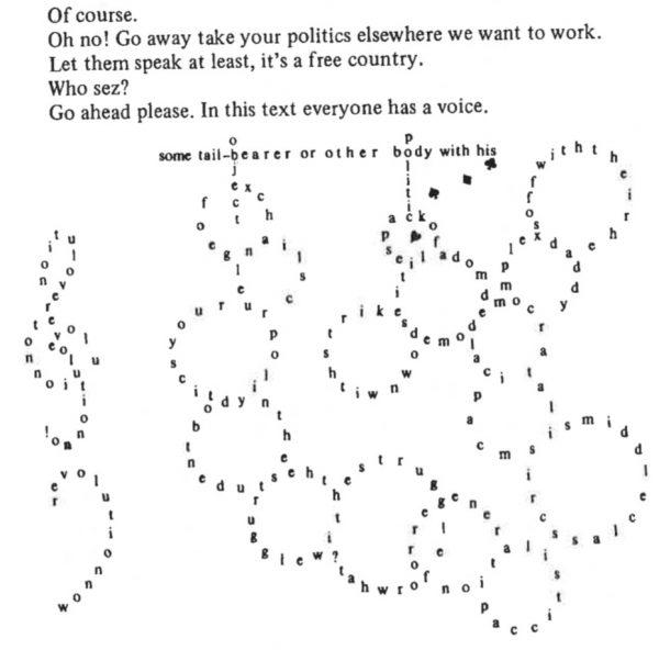 Ergodic literature can also be interactive and stimulating by means of layout, as Thru (1975) by Christine Brooke-Rose vividly shows. The book, related to a seminar on literary theory and shaped by disappearing and recurring narratives by different narrators, involves the use of concrete poetry, mesostics (When vertical phrases intersect lines of horizontal texts), videograms, graphics, spreadsheets and lists. Certain images, such as the ‘caution’ road sign or a rectangle mimicking a car’s rearview mirror, appear repeatedly throughout the novel. The practice of using words to create images provides readers with visual cues which alter conventional layout in line with the author’s musings, as figure 1 illustrates.